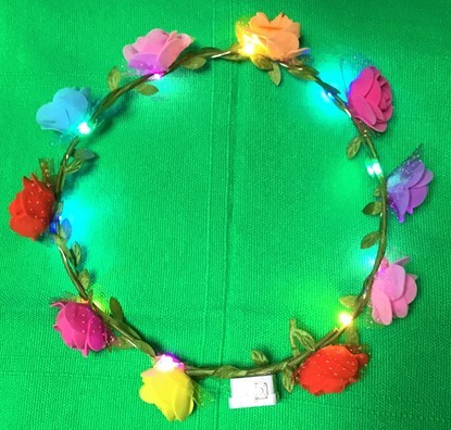 HALO WITH LED LIGHTS FOR NIGHT EVENTS. THE LED HAVE 3 SETTINGS THAT BLINK IN DIFFERENT PATTERNS. THE HALO IS NOT ADJUSTABLE AND ARE FOR STANDARD HEAD OR HAT CROWN. CASE OF 144
