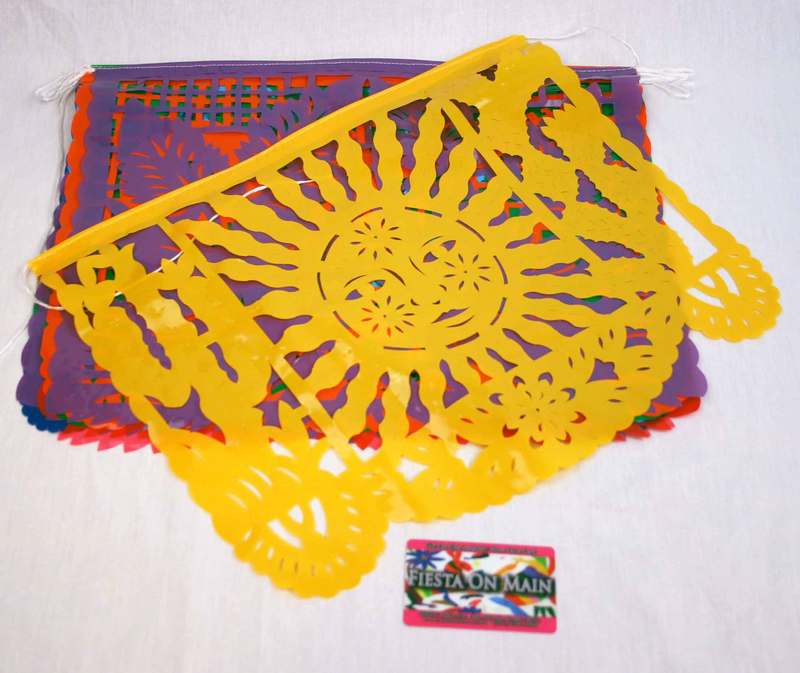 Plastic rectangular horizontal hanging decorations. Each banner is approx. 17x12 in. There are 10 banners strung together to make 18ft. long strand. Multiple banners can be hung strung together to make them longer or they can be cut to make the shorter. Can also use the individual banners just by cutting them. Each banner has a different design. Outside weather durable. Ten multi colored flags with these following designs: Sun, Flowers, Maracas, Two Doves, Guitar, Flowers (different), Cactus, Sombrero, Star Piñata, Doves (different.